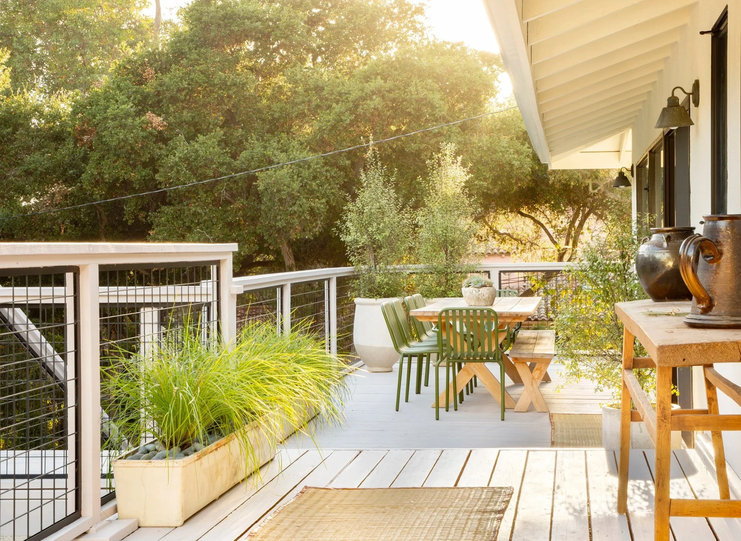 The kitchen is sweet and sunny, with built-ins, fresh light gray cabinetry, and a breakfast nook that opens to an outdoor seating area surrounded by greenery. It’s a space that invites slow mornings and lingering conversations.
