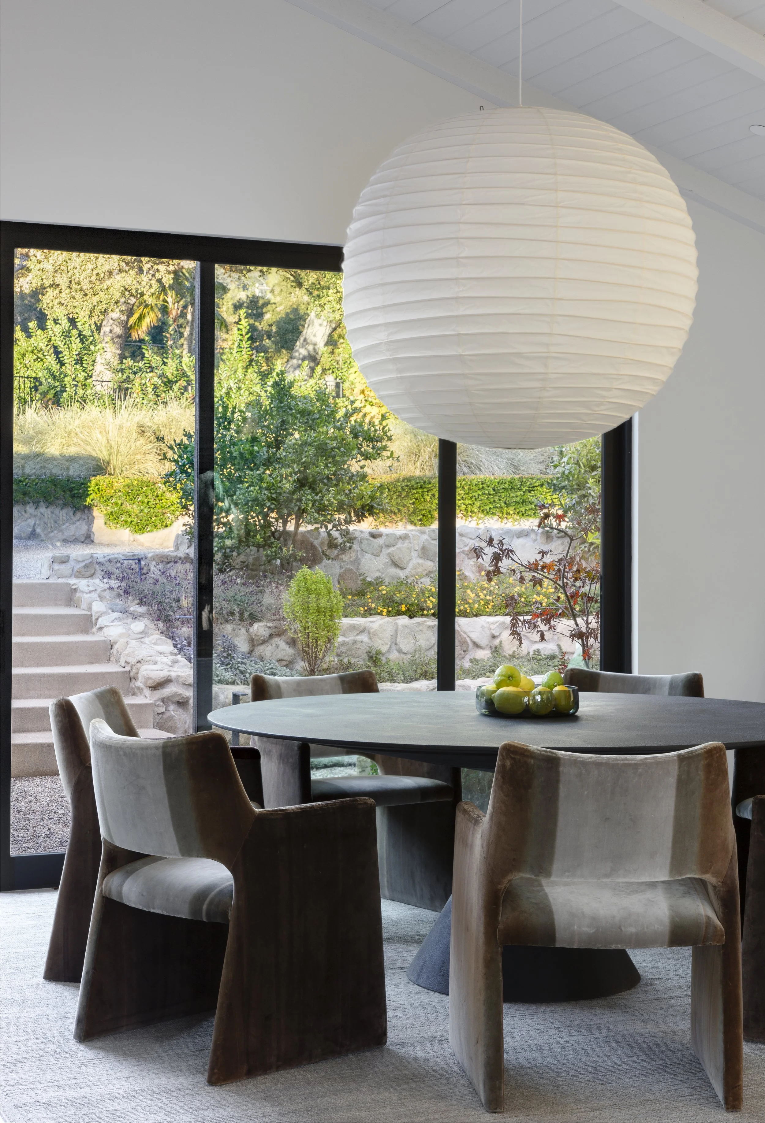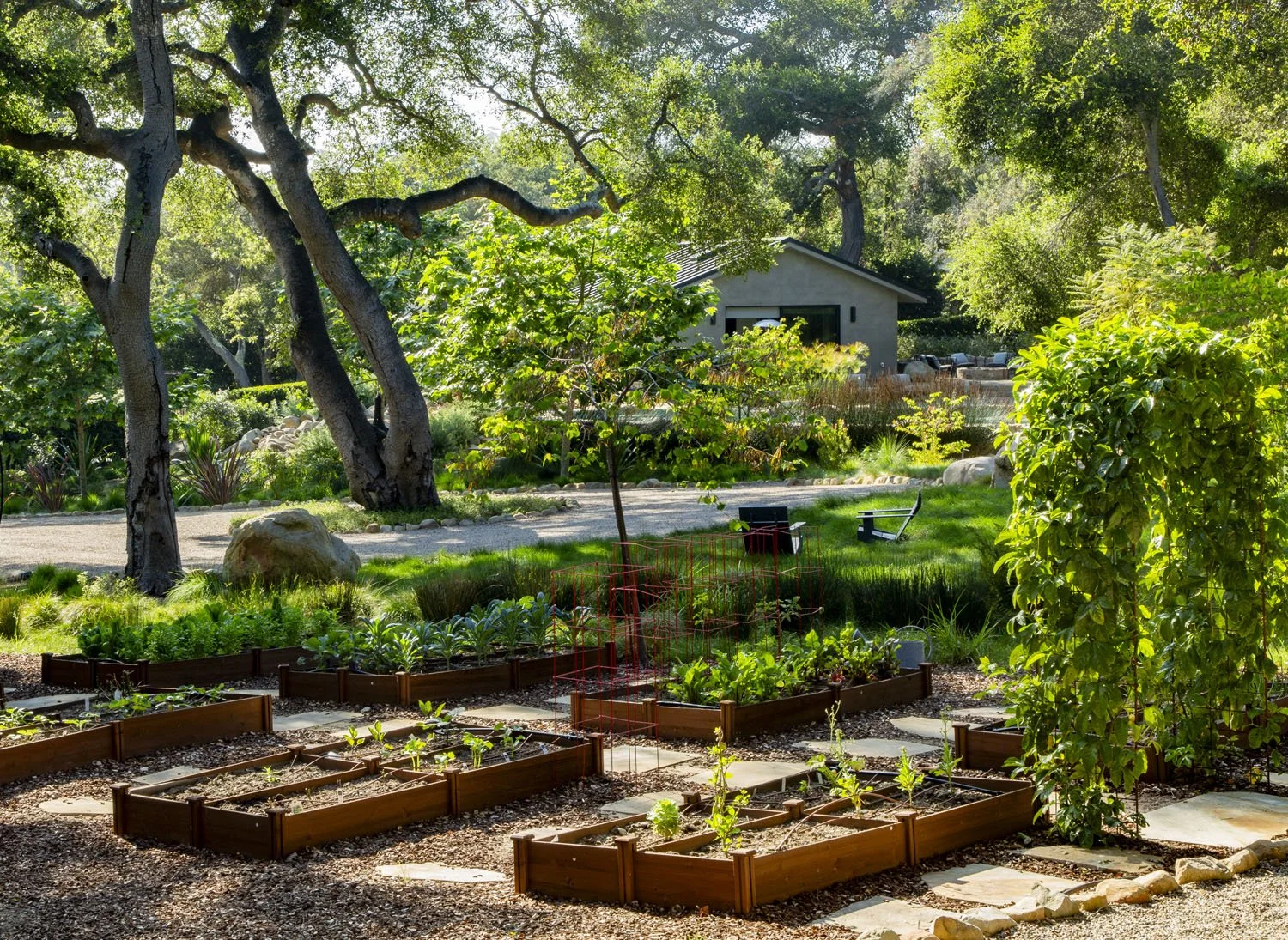 Outside, the grounds unfold as a series of outdoor rooms woven into the landscape. Gravel paths lead to a collection of seating areas tucked beneath trees and positioned throughout the property, each offering a different perspective of the gardens and oaks. A chef’s garden and a variety of fruit trees, including citrus, persimmon, apple, and passion fruit, add another layer of intention to the landscape. The pool and spa sit naturally within the setting, more hidden retreat than centerpiece.